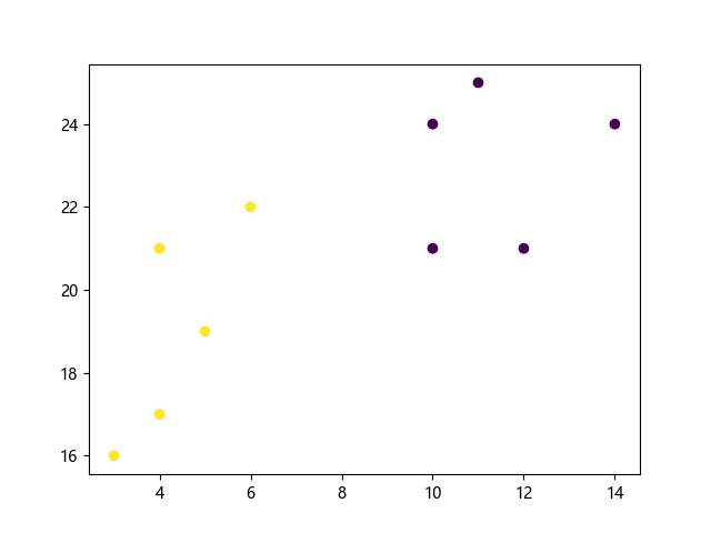# 这三行代码使编译器能够绘图: import sys import matplotlib matplotlib.use('Agg') import matplotlib.pyplot as plt from sklearn.cluster import KMeans # 定义样本数据: x = [4, 5, 10, 4, 3, 11, 14, 6, 10, 12] # 特征 1 y = [21, 19, 24, 17, 16, 25, 24, 22, 21, 21] # 特征 2 # 组合特征数据: data = list(zip(x, y)) # 创建 K-means 聚类模型(2 个簇): kmeans = KMeans(n_clusters=2) # 训练模型: kmeans.fit(data) # 绘制聚类结果散点图(按簇标签着色): plt.scatter(x, y, c=kmeans.labels_) # 显示图形: plt.show() # 这两行代码使编译器能够输出图形: plt.savefig(sys.stdout.buffer) sys.stdout.flush()