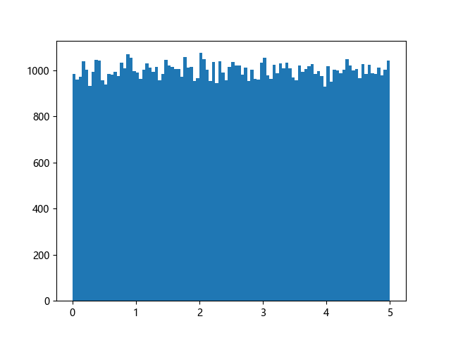 # 使编译器支持绘图的三行配置: import sys import matplotlib matplotlib.use('Agg') import numpy import matplotlib.pyplot as plt x = numpy.random.uniform(0.0, 5.0, 100000) plt.hist(x, 100) plt.show() # 实现编译器绘图功能的两行代码: plt.savefig(sys.stdout.buffer) sys.stdout.flush()