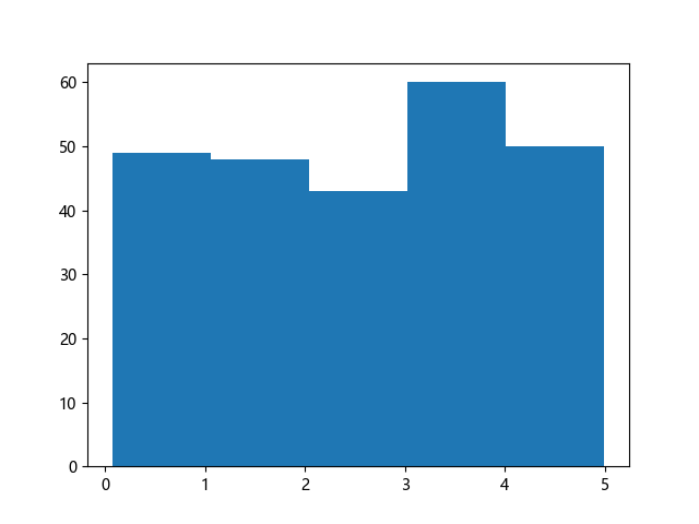 # 使我们的编译器能够绘制的三行代码: import sys import matplotlib matplotlib.use('Agg') import numpy import matplotlib.pyplot as plt x = numpy.random.uniform(0.0, 5.0, 250) plt.hist(x, 5) plt.show() # 使我们的编译器能够绘制的两行代码: plt.savefig(sys.stdout.buffer) sys.stdout.flush()