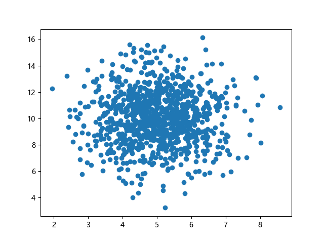 # 三行配置使编译器支持绘图功能: import sys import matplotlib matplotlib.use('Agg') import numpy import matplotlib.pyplot as plt # 生成正态分布数据:x~N(5.0,1.0),y~N(10.0,2.0),各 1000 个样本点: x = numpy.random.normal(5.0, 1.0, 1000) y = numpy.random.normal(10.0, 2.0, 1000) # 绘制散点图 plt.scatter(x, y) plt.show() # 两行代码实现图形输出: plt.savefig(sys.stdout.buffer) sys.stdout.flush()