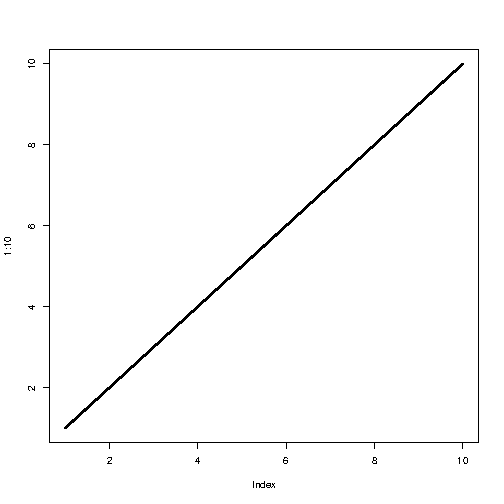 line1 <- c(1,2,3,4,5,10) line2 <- c(2,5,7,8,9,10) plot(line1, type = "l", col = "blue") lines(line2, type="l", col = "red")